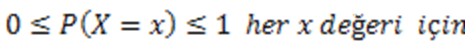 koşulu sağlanmalıdır. (ii) X kesikli rassal değişkeninin, x‘in tüm olası değerlerine eşit olma olasılıklarının toplamı 1’e eşittir. Bir başka deyişle,