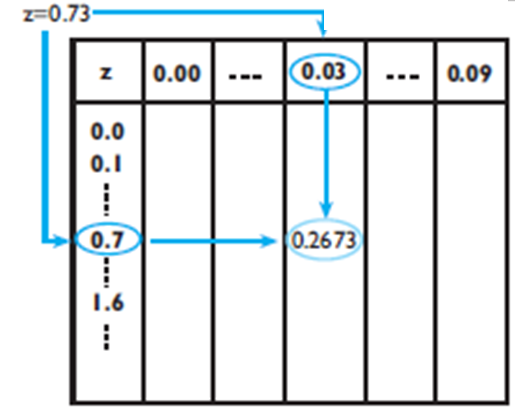 Standart normal dağılım tablosundan z sayısının karşılığı şöyle bulunur. Önce z sütunundan 0,7 değeri bulunur. Daha sonra z satırından 0,03 değeri bulunur. Bu iki değerin kesiştiği yer tablo değeridir.
