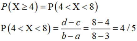 Bir sürekli rassal değişkeni a=3 ve b=8 ile sürekli düzgün dağılıma sahip olsun. P(X ?4) olasılığı kaçtır?