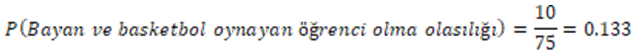 Tabloya göre bayan ve basketbol oynayan öğrencilerin toplamı 10 dur. Toplam öğrenci sayısı 75 olduğuna göre,bulunur.