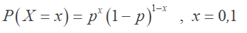Bernoulli (p) dağılımına sahip X rassal değişkeninin olasılık dağılımı, şeklinde tanımlanır. İlgili değerler yerine koyulduğunda X rassal değişkeninin olasılık dağılımı: