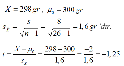 Burada n=26 ’dır. Küçük örneklem söz konusudur (n<30 olduğundan). Dolayısıyla hesaplanacak test istatistiği: