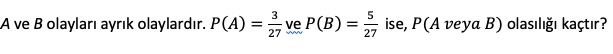 P(A veya B)=P(A)+P(B), eşitliği yardımıyla hesaplanır.