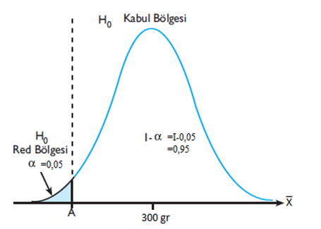 Burada evren ortalaması için tek yönlü alt kuyruk hipotez testi söz konusudur. Dolayısıyla red bölgesi sol uçta %5’lik alan olacaktır.