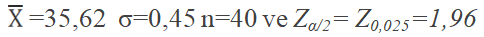 Bir üretim sürecinde üretilen birimlerin uzunlukları kontrol ediliyor. Standart sapma 0,45 mm olarak bulunuyor. Bir kalite kontrol uzmanı her sabah rasgele seçilen 40 birim üzerinde kontrolünü sürdürüyor. Bir günde ortalama uzunluk 35,62 mm olduğunda;