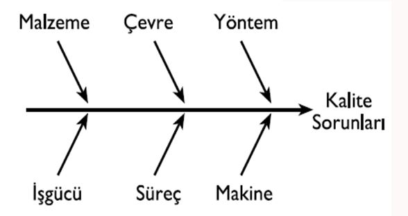 Günümüzde en sık uygulanan istatistiksel kalite kontrol teknikleri arasında histogram, akış şemaları, neden-sonuç diyagramı, frekans dağılımı, kontrol listeleri, Pareto diyagramı, verilerin gruplandırılması vb. sayılabilir. Soruda verilen diyagram Neden sonuç diyagramıdır.