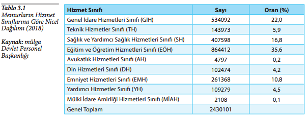 Memurların hizmet sınıflarının nicel görünümüne baktığımızda en büyük ilk üç sınıfın, Eğitim ve Öğretim Hizmetleri Sınıfı (% 35,6), Genel İdare Hizmetleri Sınıfı (22,0) ve Sağlık ve Yardımcı Sağlık Hizmetleri Sınıfı (% 16,8) olduğunu görüyoruz. Doğru cevap D'dir.