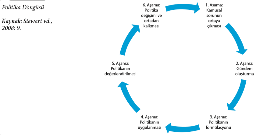 Bu süreçte ilk olarak sorunlar bir kamusal problem olarak tanımlanır, alternatif hareket tarzları üzerinde düşünülür, politikalar benimsenir, ilgili kurum personeli tarafından uygulanır, değerlendirilir, değişir ve sonunda gerçek ya da algılanan başarılarına (veya başarısızlıklarına) bağlı olarak ortadan kalkar.