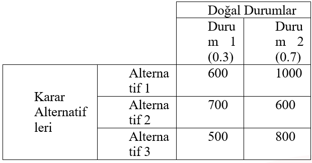Doğal durum değerleri ve olasılıkları çarpılıp toplandığında 600(0.30)+ 1000(0.45)+400(0.25)=730 elde edilir.