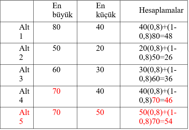 Hurwics kriterine göre karar verilirken; en iyi koşullardaki ödeme değerleri ? ile çarpılırken, geriye kalan değerler ise kötümserlik katsayısı ile çarpılır. Sonuç olarak, tüm karar alternatiflerine göre en iyi değer seçilir. Doğru cevap 38000 dir.