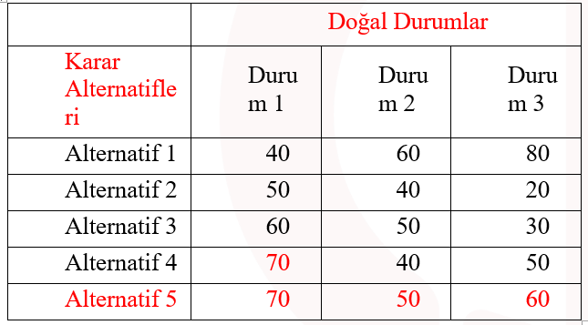 Problemin kazanç yapılı olması nedeniyle her bir karar alternatifi için ortaya çıkan en yüksek değerlerin incelenmesi gerekmektedir. Verilen tabloda en yüksek değer Alternatif 1 - Doğal Durum 3 için geçerlidir. Dolayısıyla karar vericinin seçmesi gereken alternatif ve doğal durum bu olmalıdır.