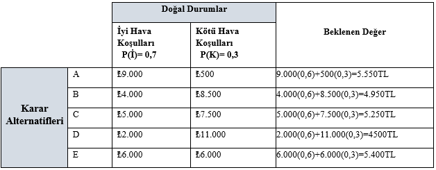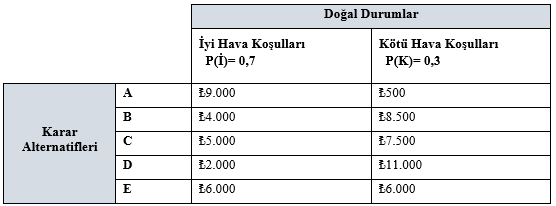 A şehrinde üretmiş olduğu ürünleri, ürünün satışının yapıldığı B şehrindeki depoya taşımak isteyen bir işletme beş farklı güzergâhtan birini seçmek zorundadır. Güzergahlar üzerinde karar verirken işletme için tek önemli kriter, kış mevsiminde bulunulması nedeniyle hava koşullarıdır. İşletme geçmiş yılların verilerine göre hava koşullarının kötü gitmesi olasılığını (P(K)) 0,30 ve iyi gitme olasılığının ise (P(İ)) 0,70 olduğunu hesaplamaktadır. Yukarıda söz konusu güzergâhlarda yapılacak üç aylık taşıma maliyetlerinin hava koşullarına göre gerçeklemesi beklenen değerleri verilmiştir. İşletmenin, en iyi beklenen değer ölçütünü kullanarak vereceği en iyi karar aşağıdakilerden hangisidir?