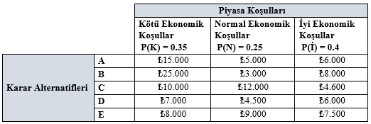 | Karar alternatifleri | İyi ekonomik durumda getiri=0,25 | Kötü ekonomik durumda getiri=0,75 | |