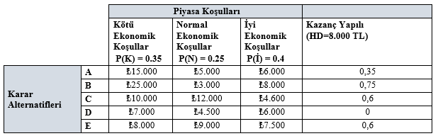 Hırs düzeyine göre doğru cevap B’dir. Çünkü karar vericinin belirlediği kazanç düzeyini sağlayan değerlere ilişkin doğal durum olasılıkları toplamı 0,75 ile diğer seçeneklerden büyüktür.