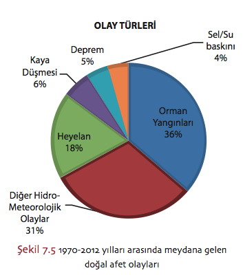 Ülkemizde 1970-2012 yılları arasındaki gerçekleşen toplam 5434 afet olayı incelendiğinde orman yangınları birinci sırayı oluştururken sel/ su baskınları ile diğer hidro-meteorolojik doğa olayları ise ikinci sırada yer almaktadırlar.