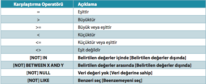 Karşılaştırma operatörleri, bir ifadeyi başka bir ifadeyle kıyaslamak için kullanılır. Bu operatörler sadece aritmetiksel ifadeler için değil aynı zamanda metin tipi ve diğer tiplerdeki verilerin kıyaslanmasında da kullanılır. Metin tipi verilerin karşılaştırılmasında büyüktür ya da küçüktür gibi operatörler, metindeki harf dizininin alfabetik sıralamasına göre hareket ederler. Sorgu oluşturmada en yaygın kullanılan karşılaştırma operatörleri aşağıdaki tabloda gösterilmiştir. SQL’in bütün karşılaştırma operatörleri CBS yazılımlarındaki sorgu oluşturucu arayüzlerde çalışmayabilmekte ya da bazılarında çalışırken bazılarında çalışmayabilmektedir. Kullandığınız yazılımın sorgu oluşturucusunun (veritabanının) hangi operatörleri desteklediği ya da hangi koşul- larda desteklediği genellikle yazılımınızın yardım (help) dosyalarında açıklanmaktadır. C¸izelgede kırmızıyla gösterilen [NOT] ifadesi, başına gelebildiği operatörün anlamını ve kullanımını zıt yönde değiştirmektedir.