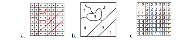 Raster veri modelinde hücreler, veriyi spektral veya tematik olarak temsil eden birbirinden farklı büyüklükteki dikdörtgenlerdir. |