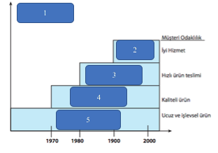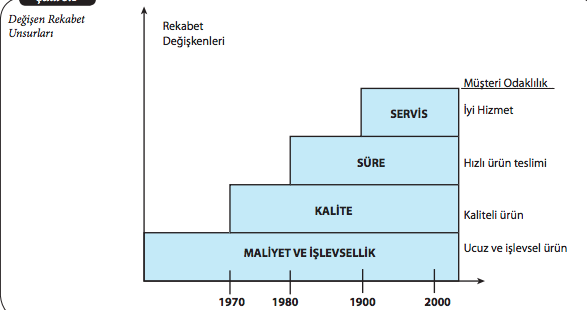 Başarıyı hedefleyen işletmeler 1970’li yıllara kadar pazarda rekabet edebilmek için ürettikleri ürünlerin maliyetlerine ve işlevselliklerine önem vermişlerdir. 1970’li yıllarda ise bu değişkenlere kaliteli mal sunmak da eklenmiştir. 1980’li yıllarda ürünlerin teslim hızı önem kazanırken 1990’lı yıllarda iyi hizmet rekabet unsuru olmuştur. 2000’li yıllarda da müşteri istekleri büyük önem kazanmıştır.