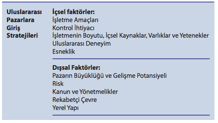 Uluslararası pazarlara giriş stratejisi belirlerken, karar verilmesi gereken iki temel konu vardır: Hangi ülke pazarına girilecektir ve bu pazara hangi yöntem ile girilecektir. Girilmesi düşünülen hedef ülke ve pazarın belirlenmesinde, içsel ve dışsal faktörlerin dikkate alınması gerekir. Bu içsel ve dışsal faktörler Aşağıdaki şekilde görülmektedir.