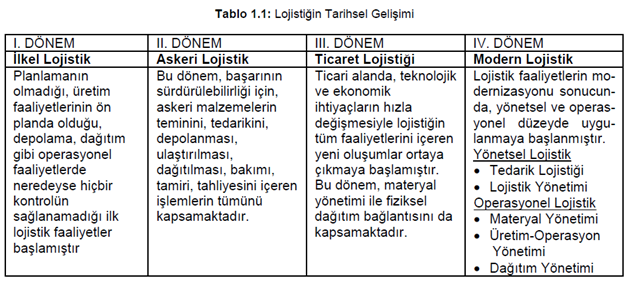 Lojistiğin tarihsel gelişiminin çok eskilere dayandığı ve günümüze kadar olan süreçte öneminin arttığı düşünüldüğünde, kavramla ilgili olarak gelişim sürecini 4 temel döneme ayırmak mümkündür. 1. Dönem; Planlamanın olmadığı, üretim faaliyetlerinin ön planda olduğu, depolama, dağıtım gibi operasyonel faaliyetlerde neredeyse hiçbir kontrolün sağlanamadığı ilk lojistik faaliyetler ile başlamıştır.