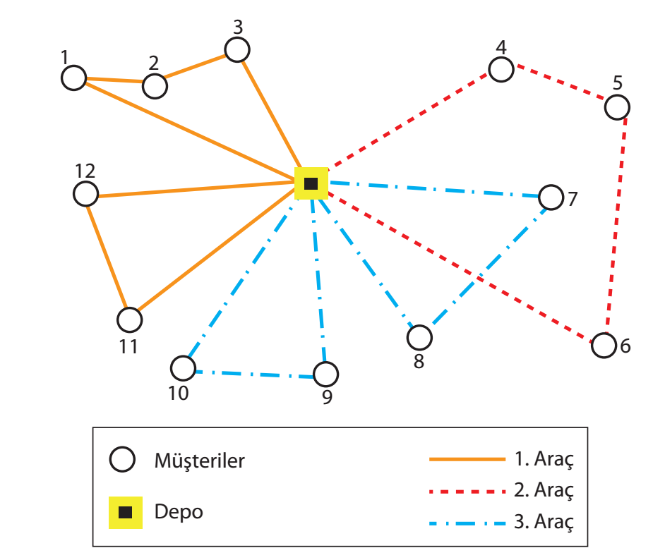 Taşıma planlamasında araç rotalama kritik bir öneme sahiptir. Araç rotalama araçların amaca yönelik olarak doğru güzergâhlara ve konumlara yönlendirilmesidir. Ürünlerin en kısa zamanda, en ekonomik koşullarda doğru adreslere sevkiyatının sağlanması işletmeler açısından büyük bir önem taşımaktadır. Benzer şekilde müşteriler için de sipariş ettikleri ürünlerin en kısa zamanda kendilerine ulaşması önemli bir husustur. Yukarıdaki şekilde 3 araç 5