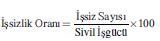 formülü kullanılır. İşsizlik sayısı 3300 bin ve sivil işgücü sayısı 30000 bin ise işsizlik oranı = (3.300/30.000)*100 = 11 olur.