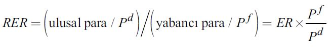 formülünü kullanırız. Burada döviz kuru yani ER 3,8’dir. pf=1 ve pd=1,9 olur, buna göre RER= 3,8*(1/1,9) = 2 olarak bulunur.