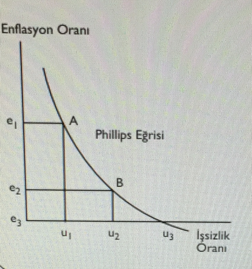 ile işsizlik oranları arasında bir değişim oranı mevcuttur. Şekil'de kısa dönemli Phillips eğrisi kullanılarak konu açıklığa kavuşturulabilir. İşsizlik oranı doğal oran olarak, örneğin u3 düzeyinde olduğunda ekonomide enflasyon yaşanmamaktadır. Çünkü, enflasyon oranı e3 düzeyinde sıfıra eşittir. İşsizlik oranını azaltmak üzere uygulanan bir genişletici politika sonucunda işsizlik oranı, örneğin u2 düzeyine gerilediği zaman enflasyon yükselmekte, örneğin e2 düzeyine çıkmakta, bu politikanın devamı hâlinde ise işsizlik oranını u1 oranına düşürmenin karşılığında enflasyon oranı e1 ’e yükselmektedir. Burada işsizlik oranını azaltmanın maliyeti enflasyon olarak ortaya çıkmaktadır. Şekildeki B noktasında yüksek işsizlik