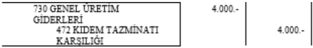 Önceki dönem sonu itibariyle üretim bölümü işçileriyle ilgili 472 KIDEM TAZMİNATI KARŞILIĞI HESABI’nın kalanı 4.000-TL’dir. Cari dönem sonunda yapılan hesaplamalar sonrasında bu tutarın 6.000.- TL olduğu hesaplanmıştır. |
