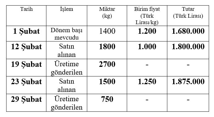 Bir işletmede Şubat ayında bir direkt ilk maddeye ilişkin stok hareketleri şöyledir: