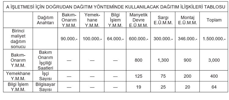 Geleneksel maliyet dağıtımı modelinin ikinci maliyet dağıtımında a en yaygın olarak kullanılan “doğrudan dağıtım yöntemi”nde; maliyeti dağıtılacak yardımcı maliyet merkezlerinin gerek kendisine gerekse diğer yardımcı maliyet merkezlerine sundukları hizmet miktarları, dağıtımda dikkate alınmaz.
