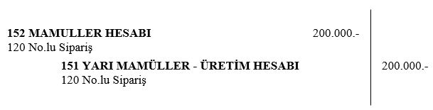 Üretimi tamamlanan ürünlerin sipariş maliyeti kartı üzerindeki birim maliyet tutarları göz önünde alınarak 152 MAMULLER HESABI’na alınması gerekmektedir. Üretimi devam eden siparişlerin maliyetleri henüz 151 YARI MAMULLER ÜRETİM HESABI’nın borcunda yer almaktadır. Dönem sonunda bu yarı mamuller maliyet tutarları ile bilançoda stoklar arasında yer alacaktır. Yukarıdaki yevmiye kaydı üretimi tamamlanan siparişlerin mamul ambarına alındığını gösterir.