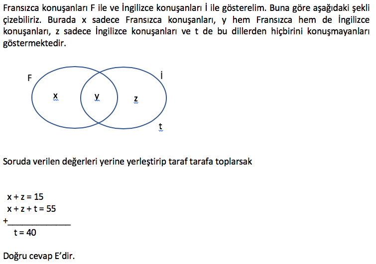 Bir toplulukta Fransızca veya İngilizce dillerinden sadece birini konuşanların sayısı 25’tir. Bu toplulukta en çok bir dili konuşanların sayısı 55 olduğuna göre bu dillerden hiçbirini konuşamayan kaç kişi vardır?
