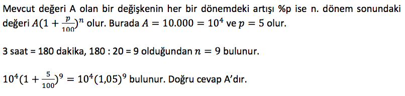 10.000 adet bakterinin her 20 dakikada %5 arttığı bilinmektedir. Buna göre aşağıdakilerden hangisi bu bakterilerin 3 saat sonraki sayısını vermektedir?