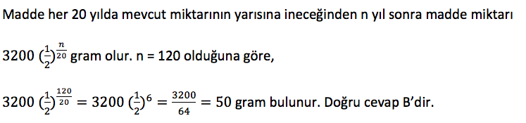 Yarılanma ömrü 20 yıl olan 3200 gram bir maddeden 120 yıl sonra kaç gram kalır?
