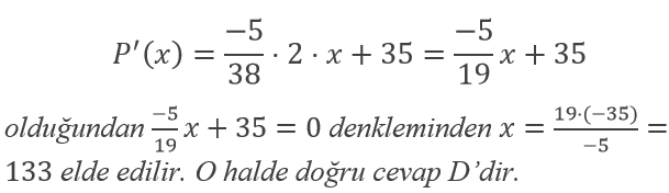 C’(x)=(2x-62)/100 olup bu denklemi sıfıra eşitlerse x= 31 sonucunu elde ederiz. Doğru cevap D’dir.