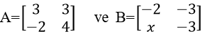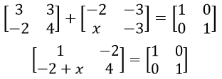 İki matrisin eşitliğinden -2+x=0 dolayısıyla x=2 olarak elde edilir.