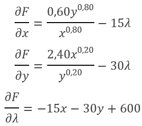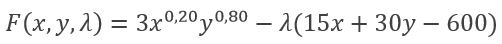 Tüketicinin parasındaki kısıt 15x+30y=600 olacaktır. Bu bütçe kısıtı altında U(x,y)=3x0,2y0,8 fonksiyonunu maksimum yapan değerleri bulalım. Lagrange fonksiyonu