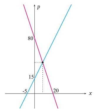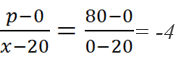 ise p=3x+15 olur. Kırmızı çizgi ile gösterilen denklemde (x1,p1)=(20,0) ve (x2,p2)=(0,80) olarak yazabiliriz.