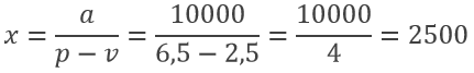 Toplam maliyetin toplam gelire eşit olduğu noktaya baş-başa noktası (ne kar ne de zararın olduğu nokta) denir. Sabit üretim giderleri a=10000 TL, birim değişken maliyet v=2,5 TL ve malın satış fiyatı p=6,5 TL olduğundan başa-baş satış miktarı