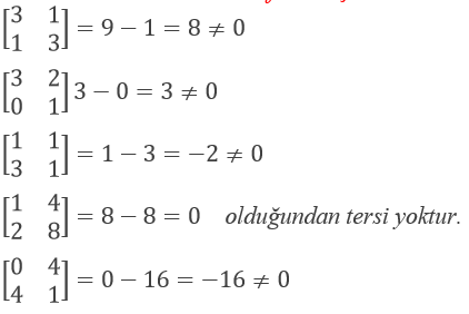 Bir matrisin tersinin olması için determinantının sıfırdan farklı olması gerekir. Buna göre seçenekler arasında determinant sıfıra eşit olanı bulmalıyız.