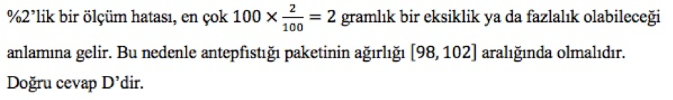 İçinde 100 gram antepfıstığı bulunan paketler için %2’lik bir ölçüm hatasına izin verildiği bilinmektedir. Buna göre antepfıstığı paketinin gram cinsinden gerçek ağırlığı hangi aralıkta olur?