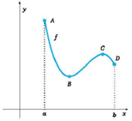 Grafiği verilen f fonksiyonunda A noktası yerel maksimum ve aynı zamanda mutlak maksimum noktasıdır; B noktası yerel minimum ve aynı zamanda mutlak minimum noktasıdır; C noktası yerel maksimum noktasıdır ve D noktası yerel minimum noktasıdır. Fonksiyon grafiği incelendiğinde fonksiyonun verilen aralıkta türevlenebildiği açıkça görülmektedir.