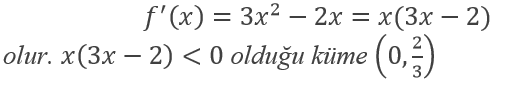 fonksiyonun azalan olduğu aralığı bulabilmek için türevini alıp fonksiyonun işaretinin negatif olduğu kümeyi bulmalıyız.