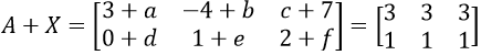 3+a=3 ise a=0, -4+b=3 ise b=7, c+7=3 ise c=-4, d=1, 1+e=1 ise e=0, 2+f=1 ise f=-1 elde ederiz ve