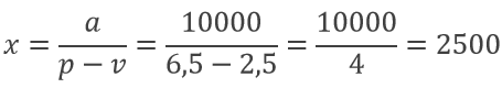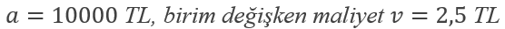 Bir malın sabit üretim giderleri 10000 TL, birim değişken maliyet 2,5 TL ve satış fiyatı 6,5 TL ise işletmenin zarar etmemesi için satış miktarının en az kaç olması gerekir?