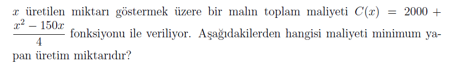 R(x)=px=(450-6x)x=450x-6x2. Toplam kar fonksiyonu: P(x)=R(x)-C(x)=450x-6x2-36x-1700=-6x2+414x-1700 olur. R'(x)=450-12x ve C'(x)=36 olduğuna göre, marjinal gelirin marjinal maliyete eşit olduğu nokta, R'(x)=C'(x) yani450-12x=36 ; x=34,5 birimdir. P''(34,5)<C''(34,5) veya P''(34,5)<0 olursa, x=34,5 bir yerel maksimum noktası olacaktır. R''(34,5)=-12 ve C''(34,5)=0 ve R''(34,5)<C''(34,5) olur. x=34,5 aynı zamanda P(x) fonksiyonunun mutlak maksimum noktası olur. x=34,5 için kar maksimum olduğuna göre maksimum kar değerini bulmak için, kar fonksiyonunda x’e 34,5 değerini verelim. Maksimum kar P(34,5)=-5441,5 bulunur.