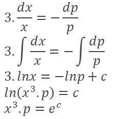 lnx=-lnp+C olup lnx+lnp=C elde edilir. Buradan logaritma özelliklerini kullanarak, ln(x.p)=C bulunur. Her iki taraf e tabanında yazılırsa, xp=eC elde edilir.