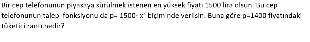 şeklinde verilmiştir. Buna göre piyasa fiyatı düzeyindeki tüketici rantı aşağıdakilerden hangisidir?