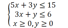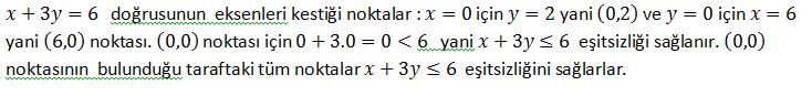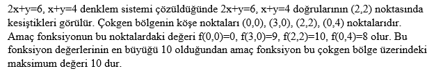 5x+3y=15 ve 3x+y=6 denklem sistemi çözüldüğünde 5x+3y=15 ve 3x+y=6 doğrularının (3/4,15/4) noktasında kesiştikleri görülür. Çokgen bölgenin köşe noktaları: (0,0), (2,0), (0,5) ve (3/4,15/4) dir. Amaç fonksiyonunun bu noktalardaki değerleri: f(0,0)=0, f(2,0)=8, f(0,5)=20 ve f(3/4,15/4)=18 olur. Bu fonksiyon değerlerinin en büyüğü 18 olduğuna göre amaç fonksiyonunun bu çokgen bölge üzerindeki maksimum değeri 18 olur.